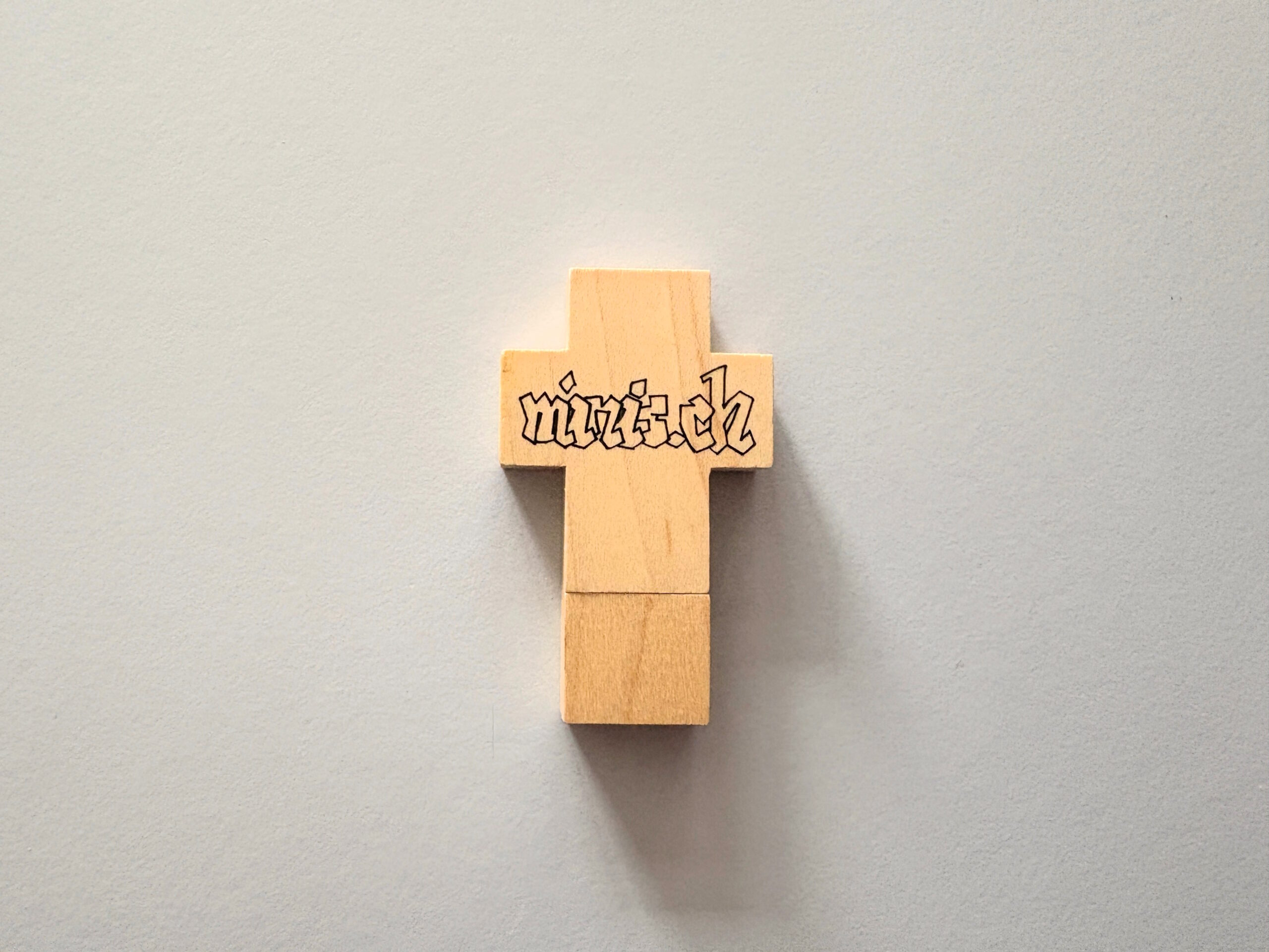 Der USBStick in Kreuzform, mit dem Schriftzug minis.ch, ist eine Extra Anfertigung für die damp.